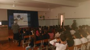 Организатор школы Чакиева Х.М-Т. для учащихся 1-10 классов в актовом зале школы показала фильм «Правила поведения при возникновении землетрясения».